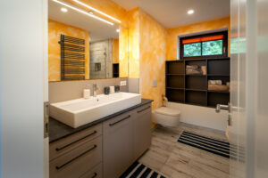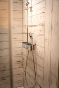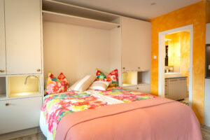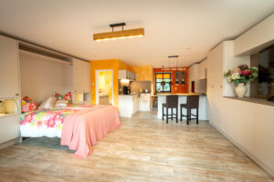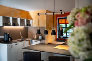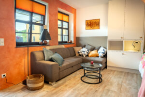 Im Obergeschoss des Seitenflügels liegt die 33 qm große Ferienwohnung »Eulenboden«, die über eine überdachte Außentreppe erreichbar ist. Das großzügig geschnittene Zimmer ist intelligent aufgeteilt: Eine offenen Küche mit Theke und Tisch lädt zum Essen ein, eine Sitzecke zum Verweilen – und das große Doppelbett kann bei Bedarf eingeklappt werden … zum Beispiel, wenn der Raum als Seminarraum Verwendung finden soll. Selbstverständlich verfügt auch diese Wohnung über TV und WLAN.